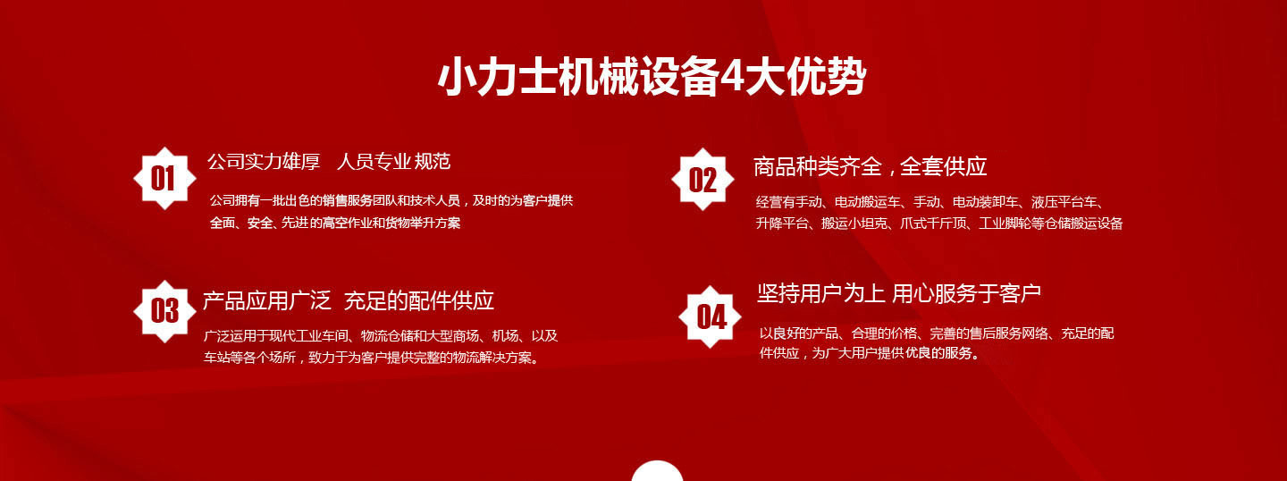 本公司致力于为广大用户提供快捷、低成本的物料搬运设备、高空作业设备、储存设备,以优良的产品、合理的价格、完善的售后服务、充足的配件供应,为广大用户提供快捷、完善的服务。【MORE】