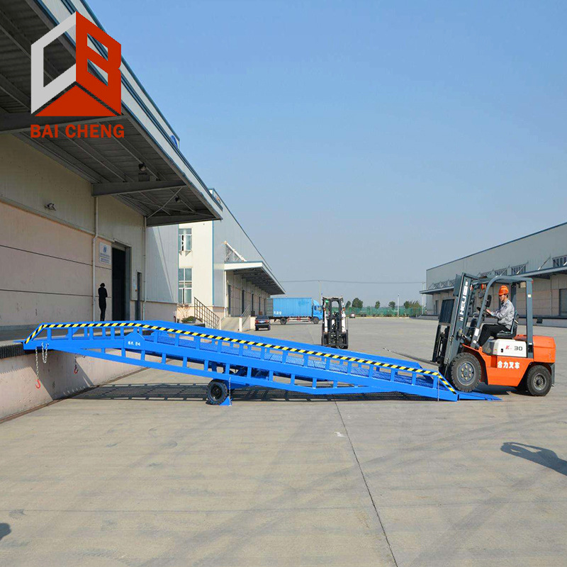 DCQY移动式登车桥是与交叉车配合使用的装卸货物的设备,叉车可以利用它直接从地面进入汽车茶香,本机器采用人工液压动力,只需一人操作就可安全快速装卸货物